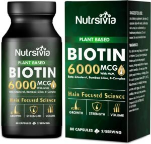 Nutrsivia’s Vegan Biotin Hair Growth Supplement is crafted for anyone seeking to boost hair thickness, strength and shine while staying true to a plant-based lifestyle. Our science-backed formula marries an advanced biotin-silicon complex with a comprehensive blend of Saw Palmetto, Beta-Sitosterol, Bamboo Silica, MSM, Nettle Leaf, Vitamin E tocotrienols, Vitamin D3, Zinc, Copper and a full B-Complex. Together, these nutrients: Fuel natural keratin production for visibly stronger, more resilient strands Support balanced DHT levels linked to healthy hair density in both men and women Promote scalp circulation & antioxidant defense for a vibrant, nourished look Assist collagen cross-linking to help skin and nails appear healthy and smooth Ginger enhance bioavailability so you get the most from every dose, while Apple Polyphenols and Amla deliver extra phytonutrient support. Each bottle provides 80 vegan capsules (40-day supply at 2 capsules daily) perfect for busy lifestyles that demand clean, effective nutrition.